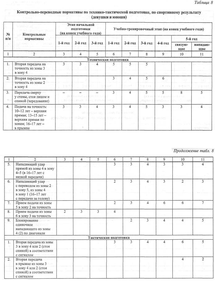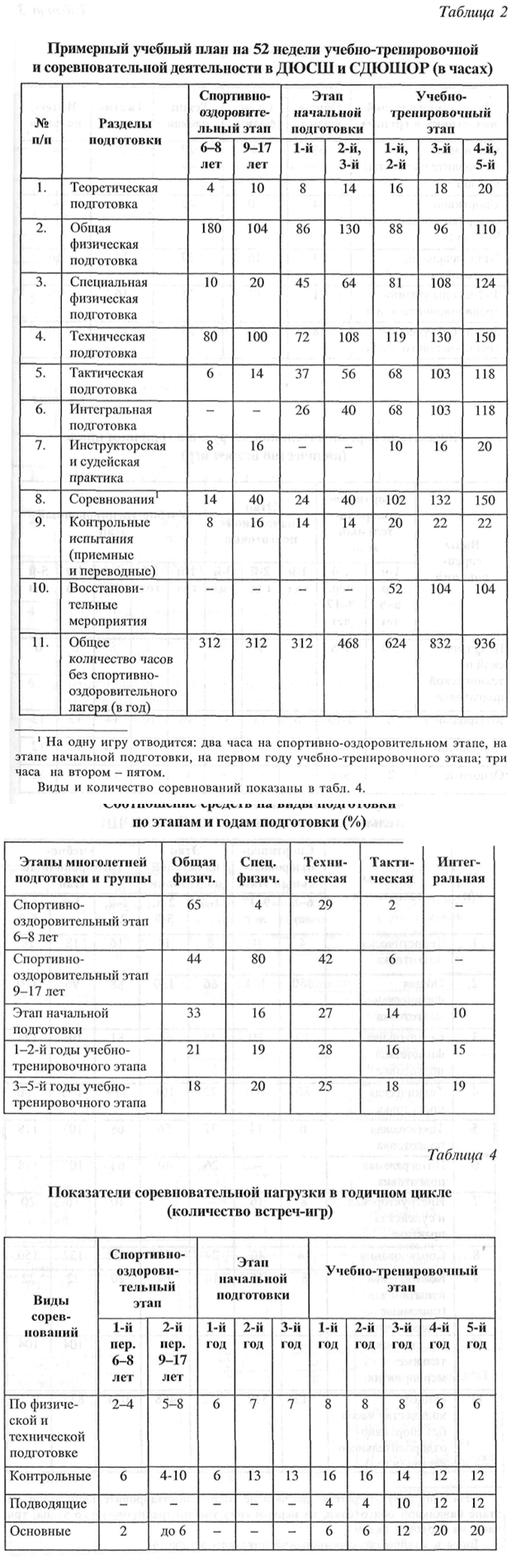ПОЯСНИТЕЛЬНАЯ ЗАПИСКА Программа составлена на основании нормативно-правовых документов, регулирующих деятельность спортивных школ, в ней отражены основные принципы спортивной подготовки юных спортсменов, результаты научных исследований, опыт работы спортивных школ по волейболу. Принцип системности предусматривает тесную взаимосвязь содержания соревновательной деятельности и всех сторон учебно-тренировочного процесса: физической, технической, тактической, психологической, интегральной, теоретической подготовки; воспитательной работы; восстановительных мероприятий; педагогического и медицинского контроля. Принцип преемственности определяет последовательность изложения программного материала по этапам многолетней подготовки в годичных циклах, соответствия его требованиям высшего спортивного мастерства. Надо обеспечить в многолетнем тренировочном процессе преемственность задач, средств и методов подготовки, объемов тренировочных и соревновательных нагрузок, рост показателей физической, технико-тактической и интегральной подготовленности. Принцип вариативности предусматривает в зависимости от этапа многолетней подготовки, индивидуальных особенностей юного волейболиста вариативность программного материала для практических занятий, характеризующихся разнообразием тренировочных средств и нагрузок, направленных на решение определенной педагогической задачи. На основании нормативно-правовых документов, определяющих функционирование спортивных школ, основополагающих принципов построения спортивной тренировки и анализа ранее изданных программ по волейболу определены следующие разделы учебной программы: объяснительная записка; организационно-методические указания; учебный план; план-схема годичного цикла; контрольно-нормативные требования; программный материал для практических и теоретических занятий; воспитательная работа; психологическая подготовка; восстановительные мероприятия; педагогический и врачебный контроль; инструкторская и судейская практика. В программе эти разделы объединены в две части - нормативную и методическую. Программа служит основным документом для эффективного построения многолетней подготовки резервов квалифицированных волейболистов и содействия успешному решению задач физического воспитания детей школьного возраста. В данной программе представлено содержание работы в ДЮСШ и СДЮШОР на трех этапах: 1 - спортивно-оздоровительном, 2 - начальной подготовки, 3 - учебно-тренировочном (табл. 1). Для всех трех этапов программный материал для практических занятий по физической подготовке не дифференцирован по годам многолетней подготовки; по технической и тактической подготовке он представлен по каждому году отдельно, даны примеры объединения упражнений в тренировочные задания, занятия и микроциклы по принципу их преимущественной направленности на развитие как отдельных физических качеств, так и комплекса качеств, на обучение технике и тактике, совершенствование спортивно-технического и тактического мастерства (см. табл. 16-20). В отдельных случаях изложение программного материала для практических занятий носит характер последовательного описания перечня основных средств подготовки для решения задач соответствующего года подготовки. Главная задача спор
