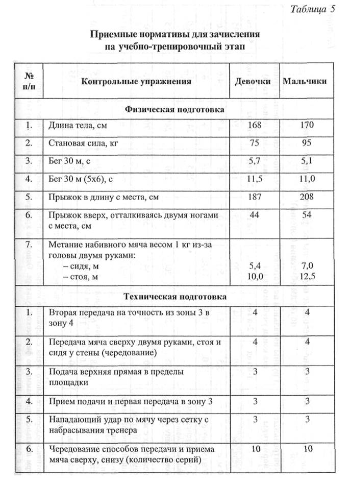 1. НОРМАТИВНАЯ ЧАСТЬ УЧЕБНОЙ ПРОГРАММЫ Нормативная часть программы содержит основные требования по возрасту, численному составу занимающихся, объему учебно-тренировочной работы, по технико-тактической, физической и спортивной подготовке. Это показано в таблицах 1-9. Спортивно-оздоровительный этап (СО). Эта форма работы охватывает всех желающих, основная задача - укрепление здоровья, физического развития и подготовленности, воспитание личностных качеств, освоение и совершенствование жизненно важных двигательных навыков, основ спортивной техники избранного вида спорта в процессе регулярных многолетних физкультурных спортивных занятий. Этап начальной подготовки (МП). На этапе начальной подготовки зачисляются учащиеся общеобразовательных школ, желающие заниматься волейболом и имеющие письменное разрешение врача-педиатра. На этапе начальной подготовки осуществляется физкультурно-оздоровительная и воспитательная работа, направленная па разностороннюю физическую подготовку и овладение основами техники волейбола, выполнение контрольных нормативов для зачисления на учебно-тренировочный этап подготовки. Учебно-тренировочный этап (УТ). Этап формируется на конкурсной основе из здоровых и практически здоровых учащихся, прошедших необходимую подготовку не менее одного года и выполнивших приемные нормативы по общей физической и специальной подготовке. Перевод по годам обучения па этом этапе осуществляется при условии выполнения учащимися контрольно-переводных нормативов по общей физической и специальной подготовке.