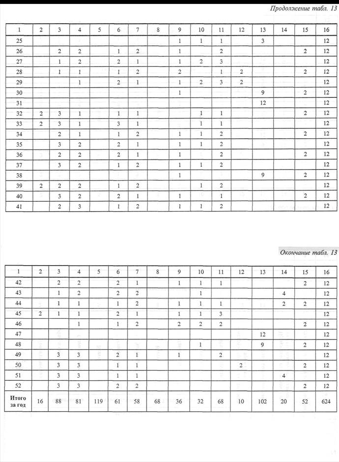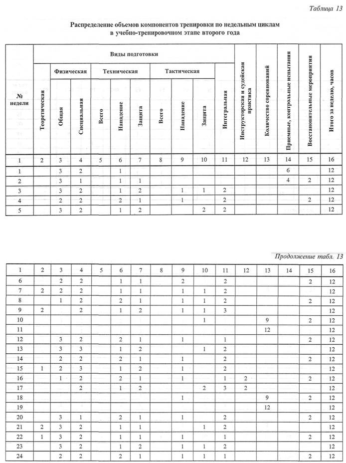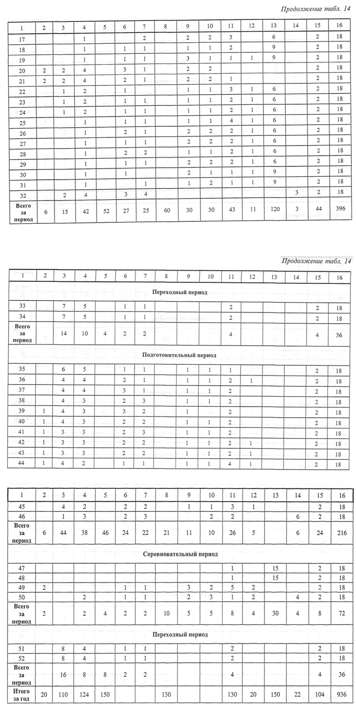 Планирование годичного цикла тренировки занимающихся спортивных школ определяется задачами, которые поставлены в конкретном годичном цикле этапа многолетней подготовки, а также календарем соревнований и закономерностями становления спортивной формы. В данном разделе на основе учебного плана (см. табл. 2) дается структура годичного цикла: раскрываются объемы компонентов тренировки по недельным циклам для каждого года обучения па этапах начальной подготовки и учебно-тренировочном, указываются сроки проведения контрольных испытаний; сроки проведения восстановительных мероприятий. На этапе начальной подготовки (табл. 12) и в первые два года на учеб! ю-тренировочном этапе (табл. 13) периодизации годичного цикла в общепринятом понимании нет, однако в период, предшествующий проведению соревнований, осуществляется работа по подготовке к участию в соревнованиях, а во время участия в них приобретается необходимый соревновательный опыт. Основное внимание уделяется физической подготовке, обучению технике и тактике игры. На учебно-тренировочном этапе с 3-го года по 5-й (табл. 11, 14) вводится периодизация, по вопросы технико-тактической и физической подготовки остаются ведущими. Программный материал распределяется так, чтобы на период соревнований приходились задачи совершенствования освоенного технико-тактического арсенала и применения приемов в условиях соревнований. По примеру таблиц 11, 12 и 13 составляются таблицы для 1-го, 2-го годов этапа начальной подготовки и 3-го, 4-го годов учебно-тренировочного этапа.