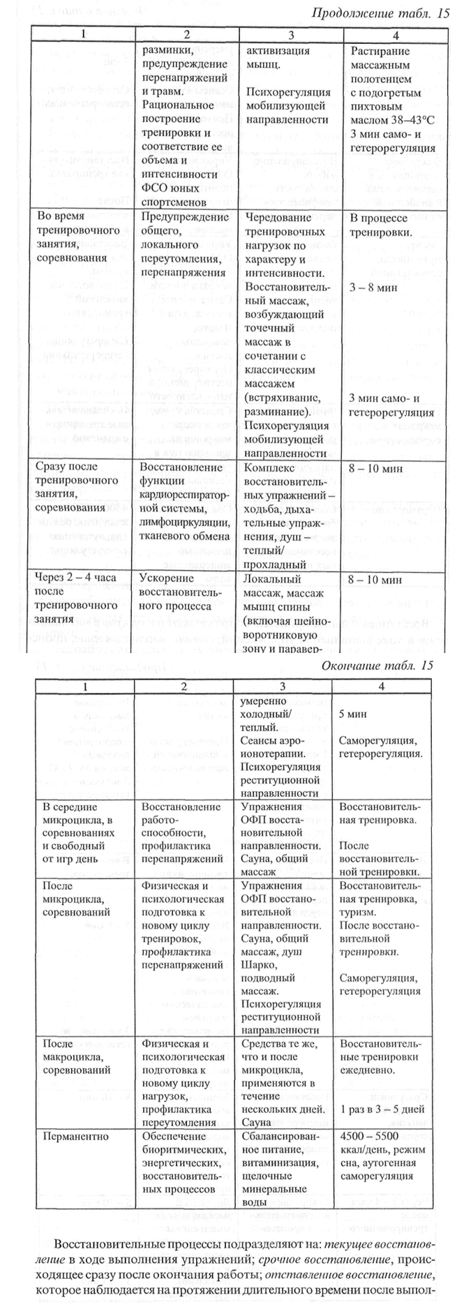нения тренировочной нагрузки; стресс-восстановление - восстановление после перенапряжений. Восстановительный период характеризуется гетерохронностью нормализации, как отдельных функций организма, так и организма в целом. Эта особенность объясняется избирательностью тренировочных воздействий и индивидуальными особенностями функционирования различных систем и органов у конкретного спортсмена. Работоспособность и многие определяющие ее функции на протяжении периода восстановления после интенсивной работы не только достигают пред рабочего уровня, помогут и превышать его, проходя через фазу «пере восстановления», которая рассматривается как суперкомпенсация. Для восстановления работоспособности учащихся спортивных школ используется широкий круг средств и мероприятий (педагогических, психологических и медико-гигиенических) с учетом возраста, этапа подготовки, интенсивности тренировочных нагрузок и индивидуальных особенностей юных спортсменов. Восстановительные мероприятия проводятся: в повседневном учебно-тренировочном процессе в ходе совершенствования общей и специальной работоспособности; в условиях соревнований, когда необходимо обеспечить быстрое и по возможности полное восстановление физической и психической готовности к следующему этапу; после тренировочного занятия, соревнования; в середине микроцикла в соревнованиях и свободный от игр день; после микроцикла соревнований; после макроцикла соревнований; перманентно. Педагогические средства восстановления включают: - рациональное планирование тренировочного процесса в соответствии с функциональными возможностями организма, сочетание общих и специальных средств, построение тренировочных и соревновательных микро-, мезо- и макроциклов, широкое использование переключений, четкую организацию работы и отдыха; - построение отдельного тренировочного занятия с использованием средств восстановления: полноценная разминка, подбор инвентаря, оборудования и мест для занятий, упражнений для активного отдыха и расслабления, создание положительного эмоционального фона; - варьирование интервалов отдыха между отдельными упражнениями и тренировочными занятиями; -разработку системы планирования с использованием различных восстановительных средств в недельных, месячных и годовых циклах подготовки; - разработку специальных физических упражнений с целью ускорения восстановления работоспособности спортсменов, совершенствования технических приемов и тактических действий. Психолого-педагогические средства включают специальные восстановительные упражнения: па расслабление, дыхательные, на растяжение, восстановительного характера (плавание, настольный теннис), чередование средств ОФП и псих регуляции. Медико-гигиенические средства восстановления включают: сбалансированное питание, физические средства восстановления (массаж, душ, сауна, паром и гипербарическую оксигепацию, сеансы аэроионотерапии), обеспечение соответствия условий тренировок, соревнований и отдыха основным санитарно-гигиеническим требованиям. Психологические средства восстановления включают: психорегулирующую тренировку, упражнения для мышечного расслабления, сон -отдых и другие приемы психогигиены и психотерапии. Особенно следует учитывать отрицательно действующи