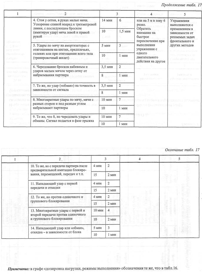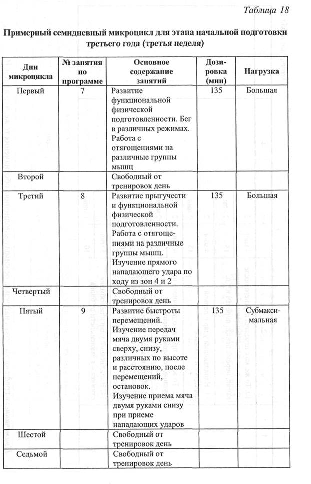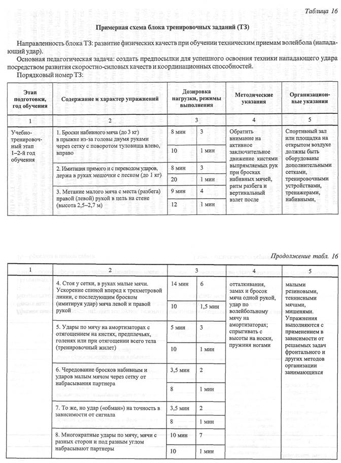 Содержание и структура тренировочного процесса определяются во многом содержанием и структурой соревновательной деятельности, соревновательными действиями спортсменов и условиями их выполнения. Волейбол отличается большим разнообразием соревновательных (технико-тактических) действий, многократным их выполнением в процессе одной встречи (игры) отдельными игроками и во взаимодействии с членами команды. Все в целом составляет систему соревновательно-тренировочной деятельности, куда входят: соревнования, содержание соревновательных действий; тренировка и ее составляющие - техническая, тактическая, физическая, психическая, теоретическая и интегральная подготовки; тренировочные занятия; тренировочные задания; арсенал упражнений: общеразвивающих, подготовительных, подводящих, по технике, по тактике, интегральных; учебных, контрольных и календарных игр. Из арсенала упражнений формируются тренировочные задания, которые объединяются в тренировочные занятия, тренировочные занятия образуют микроциклы, микроциклы - мезо циклы, которые объединяются в макроциклы - годовой цикл тренировки и многолетние циклы подготовки. Таким образом, тренировочные задания являются важнейшим начальным структурным компонентом тренировочного процесса. Тренировочные задания (ТЗ) - это физическое упражнение или их комплекс, специально созданный для решения конкретных задач тренировочного процесса. Тренер разрабатывает каталоги тренировочных заданий по каждому виду подготовки, для тренировочных занятий по направленности, для разных типов микроциклов, по игровым функциям (амплуа) волейболистов. Тренировочные занятия подразделяются по направленности: по физической подготовке (общей, специальной); технической (обучение, совершенствование); тактической (обучение, совершенствование); комбинированные (по технической и физической; по технической и тактической; по технической, тактической, физической); целостно-игровой (по типу комбинированных) подготовки; контрольные; для разминки перед игрой. С учетом сказанного тренировочные задания группируются в отдельные блоки по принципу их преимущественной направленности. Каждое тренировочное задание должно иметь конкретные педагогические и воспитательные задачи; содержание занятия (комплекс упражнений и последовательность их выполнения); дозировку нагрузки и режим ее выполнения (интенсивность, количество повторений, серий, вес спортивных снарядов, длина дистанций); продолжительность и характер пауз отдыха и др.); методические указания (год обучения, возможные ошибки при выполнении упражнения и способы их устранения); организационные указания (место проведения занятий, необходимый инвентарь и оборудование). В основной части занятия концентрируются упражнения конкретной преимущественной направленности. В таблицах 16-20 приводятся в качестве примера блоки ТЗ для групп МП и УТГ и содержание микроциклов.