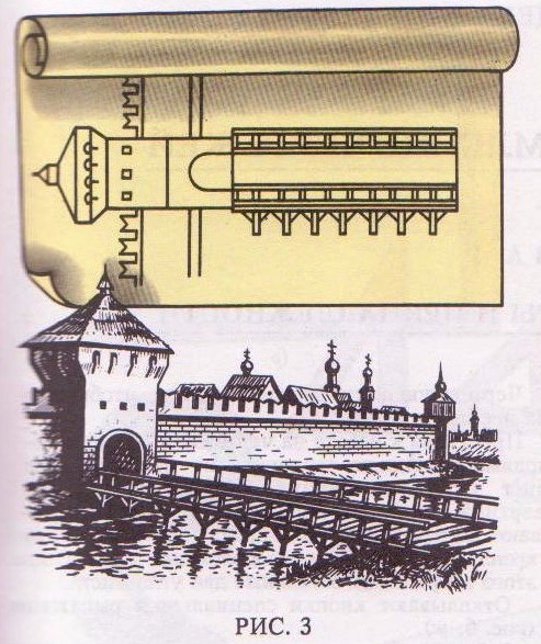 хорошо владели геометрией и успешно решали сложные технические задачи. Так, например, в летописях XIII–XIV вв. найдены рисунки, по которым можно определить, способ изготовления предметов. Рассматривая рис. 2, видим, что ствол пушки изготовлен горновой или кузнечной сваркой и укреплен насадными кольцами-бандажами. Часто на одном изображении совмещались план (вид сверху) и фасад (вид спереди) изображаемого сооружения, например мост; и (рис. 3). Неудобство такого совмещения заставило разъединить виды. В дальнейшем при изображении предметов стали использовать два, три и более видов. Русские зодчие, под руководством которых строились крепости и другие сооружения в Киеве, Пскове, Новгороде, Суздале, умели выполнять и использовать достаточно сложные чертежи. По проекту и под руководством архитектора Федора Коня в 1586–1592 гг. для отражения вражеских нашествий была построена в Москве огромная каменная стена с многочисленными башнями