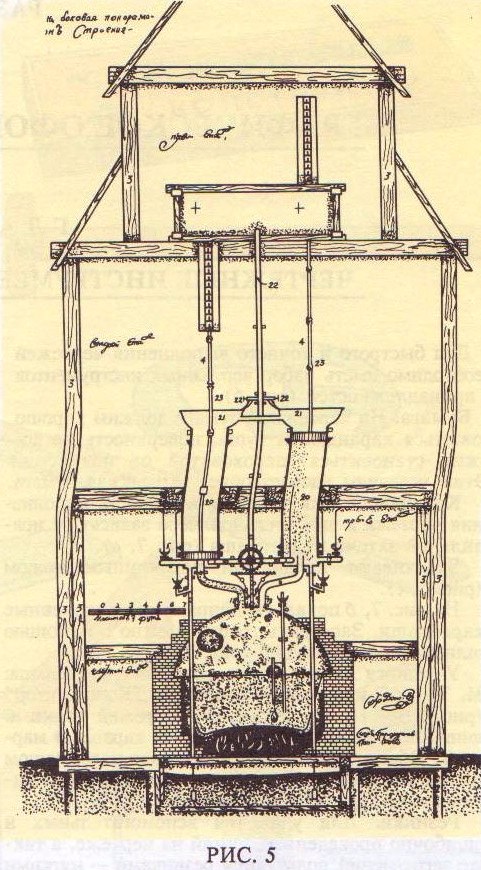 рия", который лег в основу проекционного черчения. Задолго до появления начертательной геометрия в отдельных чертежах русских умельцев использовался метод прямоугольного проецирования. Чертежи И.И. Ползунова и И.П. Кулибина наглядно показывают отличные познания русских изобретателей в области построения точного проясненного чертежа изделия (рис. 5). Основоположником начертательной геометрии в России был проф. Я.А. Севастьянов, издавший 1821 г. свой курс " Основания начертательной геометрии". Выдающийся ученый конца XIX в.
