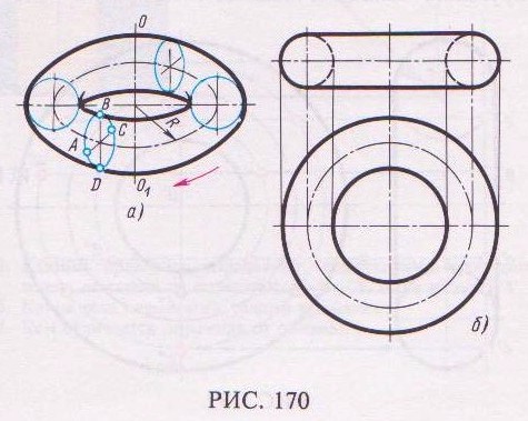 Поверхность кругового кольца (рис. 170, а) образована вращением образующей окружности ABCD вокруг оси ОО1. Тор – поверхность, образованная вращением части дуги окружности, являющейся образующей, вокруг оси ОО1, расположенной в плоскости этой окружности и не проходящей через ее центр. На рис. 171, а и б приведены два вида тора. В первом случае образующая дуга окружности радиуса R отстоит от оси вращения на расстоянии меньше радиуса R, а во втором случае – больше.