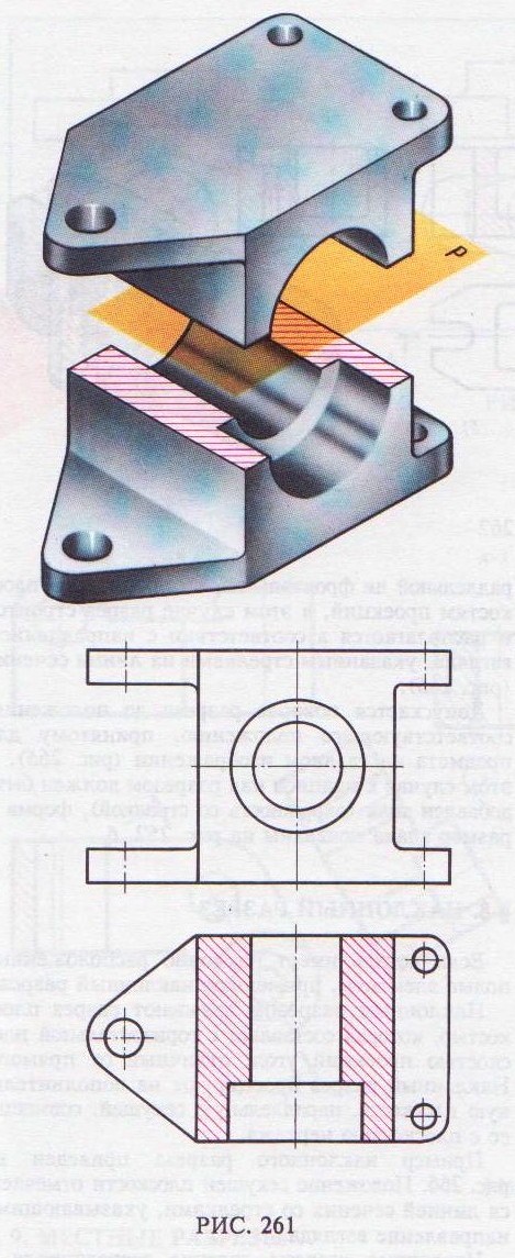 Горизонтальными разрезами называются разрезы, образованные секущими плоскостями, параллельными горизонтальной плоскости проекции. На рис. 261 деталь рассечена горизонтальной плоскостью Р, параллельной горизонтальной плоскости проекции. Верхняя часть детали мысли удалена, а оставшаяся нижняя часть спроецирована на горизонтальную плоскость проекции. Горизонтальные, фронтальные и профильные разрезы
