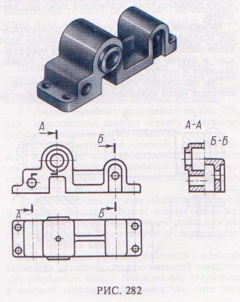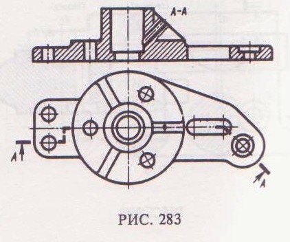 Для того чтобы сделать чертежи более простыми и понятными, а также с целью экономии времени при выполнении чертежа, ГОСТ 2.305–68 устанавливает следующие условности и упрощения. Например, допускается совмещать два разреза, если каждый из них представляет симметричную фигуру. На рис. 282 совмещены половина профильного ступенчатого разреза А–А и половина простого профильного разреза Б–Б. Допускается применение сложных разрезов, представляющих сочетание ступенчатых и ломаных разрезов (рис. 283). Элементы детали, расположенные за секущей плоскостью и проецирующиеся с искажением их формы, на разрезе можно не изображать (см. левое ребро жесткости на рис. 283), если это не требуется для выявления конструкции детали.