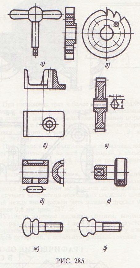 При выполнении продольных разрезов таких элементов, как тонкие стенки, ребра жесткости, ушки и т.п., они показываются на разрезе нерас-сеченными (рис. 284). Если в упомянутых элементах имеются какие-либо отверстия, то выполняют местный разрез (см. правое ребро жесткости, рис. 283). На рис. 285 приведены условности, которые устанавливает ГОСТ 2.305–68. Рукоять (рис. 285, а), состоящая из стержней в форме тел вращения, при выполнении разреза также показывается нерассеченной, полный продольный разрез такой детали нецелесообразен. Чтобы выделить на чертеже плоские поверхности, обычно квадратной или прямоугольной формы, на них проводят диагонали сплошными тонкими линиями (рис. 285, а и ё). При наличии нескольких равномерно расположенных элементов предмета (зубья колеса храпового механизма и отверстий на нем, рис. 285, б) показывают один-два таких элемента, а остальные изображают упрощенно или условно, но так, чтобы была сохранена ясность расположения всех элементов. На тех изображениях, на которых уклон или конусность отчетливо не выявляются, проводят только одну линию, соответствующую меньшем; размеру элемента с уклоном или меньшему основанию конуса (рис. 285, в).