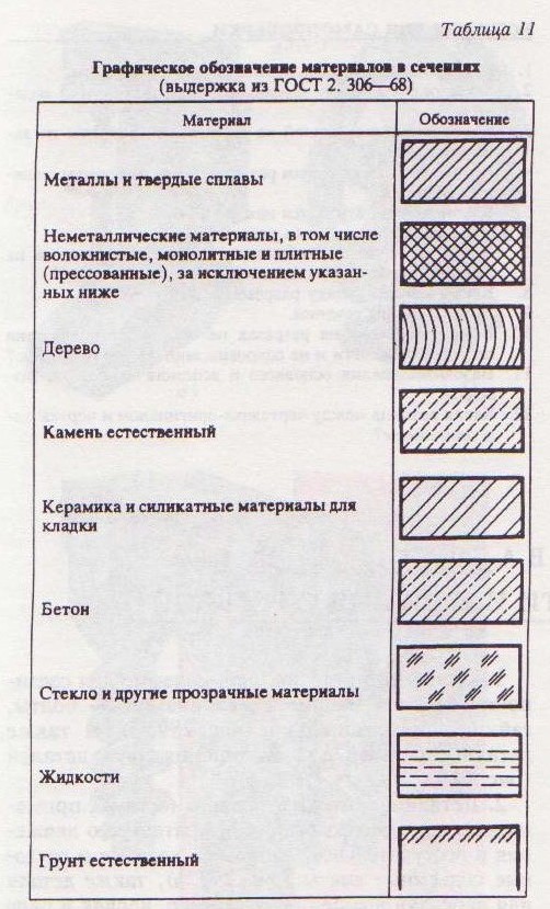 ГРАФИЧЕСКИЕ ОБОЗНАЧЕНИЯ МАТЕРИАЛОВ В СЕЧЕНИЯХ Вмашиностроении используются детали, изготовленные из различного материала. Для наглядности и выразительности чертежей введены условные графические обозначения материалов. ГОСТ 2.306–68 устанавливает графические обозначения материалов в сечениях и на фасадах, а также правила нанесения их на чертежи всех отраслей промышленности и строительства. Графические обозначения материалов в сечениях должны соответствовать указанным в табл. 11. Общее графическое обозначение материалов в сечениях независимо от вида материалов – сплошные тонкие параллельные прямые линии, наклонные под углом 45° к линиям рамки чертежа (рис. 287, а и в). Если линии штриховки, про- веденные к линиям рамки под углом 45°, совпадают по направлению с линиями контура или осевыми линиями, то вместо угла 45° следует брать угол 30 или 60° (рис. 287, б, г, д). Линии штриховки должны наноситься с наклоном влево или вправо, в одну и ту же сторону на всех сечениях, относящихся к одной и той жедетали, независимо от числа листов, на которых эти сечения расположены. Для смежных сечений двух деталей следует делать наклон штриховки в разные стороны(рис. 287, ж). Расстояние между линиями штриховки должно быть от 1 до 10 мм в зависимости от площади штриховки.
