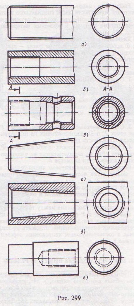 Невидимую резьбу показывают штриховыми линиями одной толщины по наружному и по внутреннему диаметру (рис. 299, в, е). Пример конической наружной резьбы показан на рис. 299, г. Внутренняя коническая резьба в разрезе приведена на рис. 299, д.