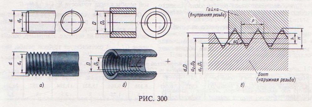 Метрическая резьба наиболее часто применяется в крепежных деталях (винты, болты, шпильки, гайки). Основные размеры метрической резьбы устанавливает ГОСТ 24705–81. Номинальный профиль и размеры его элементов устанавливает ГОСТ 9150–81. На рис. 301, а изображен профиль метрической резьбы: d – наружный диаметр резьбы (болта); d1 – внутренний диаметр болта; Р – шаг резьбы; ГОСТ 8724–81 устанавливает диаметры и шаги метрической резьбы (табл. 12). Кроме того, стандартизирована резьба метрическая для диаметров от 1 до 180 мм на деталях из пластмасс, ГОСТ 11709-81. В зависимости от назначения детали метрическую резьбу нарезают с крупным или мелким шагом. При одинаковых номинальных диаметрах шаг мелкой резьбы может быть различным (табл. 12). Основные размеры метрической резьбы устанавливает ГОСТ 24705-81 (табл. 13). Величина шага в обозначение резьбы с крупным шагом не входит, так как каждому наружному диаметру резьбы по ГОСТ 8724–81 (см. табл. 12) соответствует только одно значение крупного шага. В обозначении метрической резьбы с мелким шагом должна указываться величина шага, так как шаг может быть различным при одном и том же наружном диаметре резьбы (см. табл. 12). Метрическая резьба с крупным шагом обозначается буквой М и размером наружного диаметра, например M16, М42, М64. Метрическая резьба с мелким шагом обозначается буквой М, размером наружного диаметра и шагом резьбы, например: М16× 0, 5; М42× 2; М64× 3.