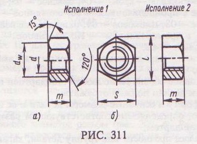 рации, толчки и удары, ведущие к самоотвинчиванию гаек и болтов. Шплинт или проволока будут этому препятствовать. Основные размеры наиболее распространенных в машиностроении болтов с шестигранной головкой нормальной точности (рис. 310, б) приведены в табл. 20. Каждому диаметру резьбы болта d соответствуют определенные размеры его головки. При одном и том же диаметре резьбы d болт может изготавливаться различной длины l, которая стандартизирована. Длина резьбы болта l0 также стандартизирована и устанавливается в зависимости от его диаметра d и длины l (ГОСТ 7798–70). Формы и размеры концов болтов с метрической резьбой должны соответствовать ГОСТ 12414–94. Рабочий чертеж болта (рис. 310, б) выполняется по размерам, взятым из соответствующего стандарта. Условное обозначение болта: Болт 2 M16× 1, 5. 6g× 75.68.09 ГОСТ 7798-70. Расшифровывается следующим образом: 2 – исполнение; М16 – тип и размер резьбы; 1, 5 – величина мелкого шага резьбы; 6g – поле допуска; 75 – длина болта; 68 – условная запись класса прочности, указывающего, что болт выполнен из стали с определенными механическими свойствами; 09 – цинковое покрытие; ГОСТ 7798–70 – стандарт, указывающий, что болт имеет шестигранную головку и выполнен с нормальной точностью. ГАЙКИ Гайки навинчиваются на резьбовой конец болта, при этом соединяемые детали зажимаются между гайкой и головкой болта. По форме гайки могут быть шестигранными, квадратными, круглыми. Наиболее часто используются шестигранные гайки (рис. 311, а) по ТОСТ 5915-70 в двух исполнениях: с двумя и одной наружными фасками (рис. 311, б).