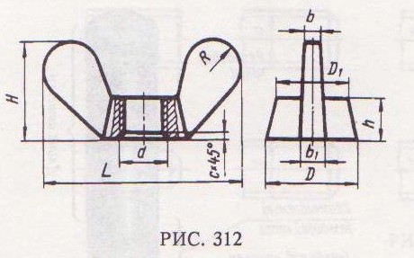 Чертеж гайки выполняется по размерам, взятым из соответствующего стандарта. Имеются низкие гайки (ГОСТ 5916-70 и ГОСТ 15522-70), высокие (ГОСТ 15523–70) и особо высокие (ГОСТ 15525-70). Для завертывания гаек без ключа применяются гайки–барашки (рис. 312), которые выбираются по ГОСТ 3032-76. Шестигранная гайка в исполнении 1 по ГОСТ 5915-70 (см. рис. 311, б) с полем допуска 6Н, класса прочности 6, без покрытия обозначается: Гайка М24-6Н.6 ГОСТ 5915-70. Гайка–барашек, изготовленная по ГОСТ 3032-76, обозначается: Гайка М24-6Н.04 ГОСТ 3032-76. ВИНТЫ Винтом называется резьбовой стержень, на одном конце которого имеется головка. Винты изготавливаются с головками разных форм (рис. 313, а): цилиндрическими
