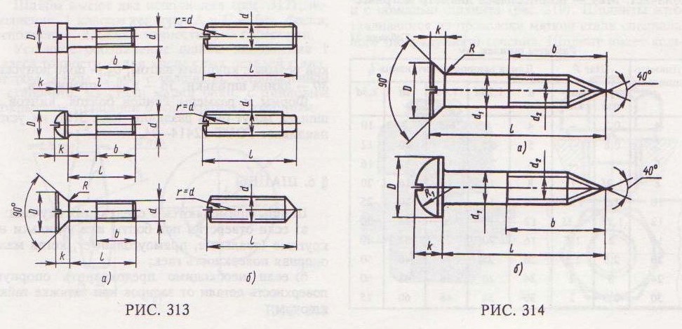 ГОСТ 1491-80, с ГОСТ 17473-80, с ГОСТ 17475-80 и др. Винты бывают двух видов: крепежные и установочные. Некоторые типы установочных винтов не имеют головок (рис. 313, б). Установочные винты применяются для регулировки зазоров и фиксации деталей при сборке. В условное обозначение винта входят все элементы обозначения крепежной детали (рассмотренные выше): Винт A M8-6g× 50.48 ГОСТ Р 50404–92, где А – класс точности, М8 – диаметр резьбы, 6g – поле допуска, 50 – длина, 48 – класс прочности. ШУРУПЫ Шурупы ввертываются в дерево и некоторые полимерные материалы (пластмассы). Шурупы выпускаются с потайной головкой (ГОСТ 1145-80) (рис. 314, а), с полукруглой головкой (ГОСТ 1144–80) (рис. 314, б) и с полупотайной головкой. Шурупы с потайной головкой имеют головку конической формы, которая располагается в специальном углублении (зенковке), выполняемом в закрепляемой детали, благодаря чему головка не выступает над поверхностью этой детали. Пример обозначения шурупа исполнения 1, диаметром d = 3 мм, длиной l = 20 мм из низкоуглеродистой стали без покрытия: Шуруп 1-3× 20 ГОСТ 1144-80.