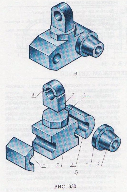 Конструирование деталей машин является сложным творческим процессом, сопровождающимся решением ряда задач; в частности, обеспечение прочности и износоустойчивости детали, технологичности, наименьшей массы и т.п. Решение этих задач во многом зависит от придания детали рациональных геометрических форм. Какую бы сложную форму ни имела деталь, конструктор выполняет ее как совокупность простейших геометрических тел или их частей. Форма детали определяет технологический процесс ее изготовления; например, если сконструировать деталь несимметричной формы (рис. 329, а), то изготовить ее на металлорежущем станке сложнее, чем симметричную (рис. 329, б). Пример анализа формы детали дан на рис. 330. Деталь состоит из следующих элементов: 1 – часть шестиугольной призмы с отверстием; 2 – параллелепипед с отверстиями; 3 – часть полого цилиндра; 4 – полый цилиндр; 5 – конус с цилиндрическим отверстием; 6 – восьмиугольная призма;