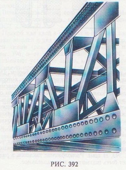 Клепаные соединения применяются в соединениях деталей из металлов, в основном плохо поддающихся сварке, при соединении металлических изделий с неметаллическими. Эти соединения применяются в конструкциях, работающих под действием ударных и вибрационных нагрузок. Например, при изготовлении металлоконструкций мостов кроме сварного соединения в некоторых случаях применяют клепаные соединения (рис. 392). Заклепка представляет собой стержень круглого сечения, имеющий с одного конца головку, форма головки бывает различной. На рис. 393, а показано соединение двух деталей с помощью заклепок с полукруглой (сферической) головкой. В соединяемых деталях выполняются отверстия, диаметр которых несколько больше диаметра непоставленной заклепки. Заклепка вставляется в отверстия в деталях, и ее свободный конец расклепывается обжимками клепального молотка или машины. Длина стержня заклепки L выбирается так, чтобы выступающая из детали часть была достаточной для придания