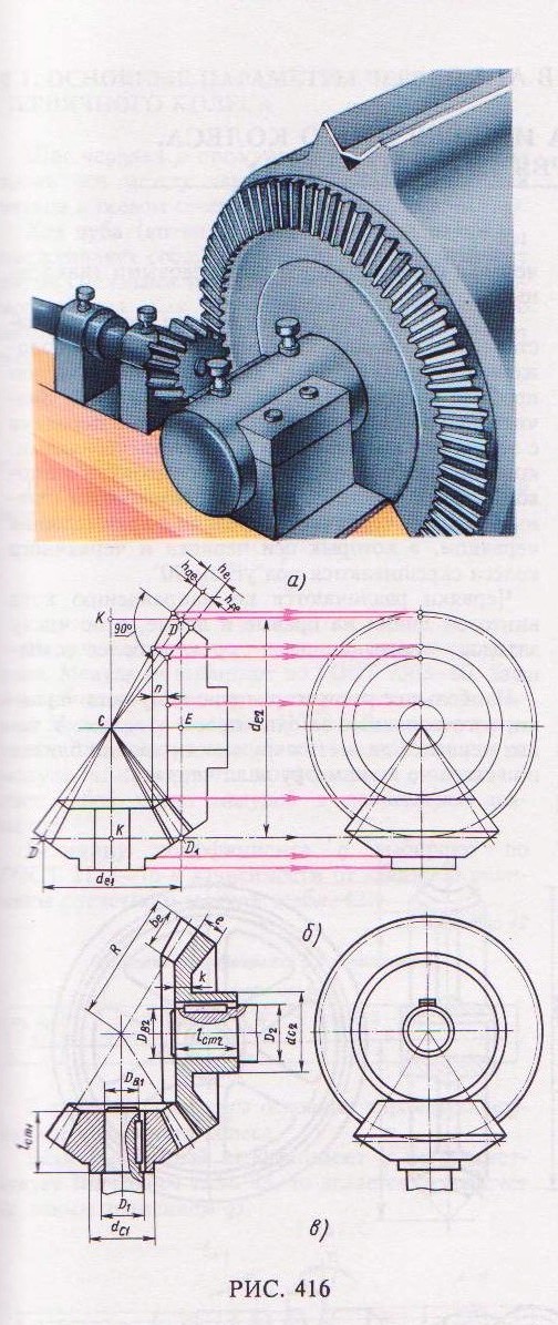 Коническая зубчатая передача (рис. 416, а) изображается по правилам, установленным ГОСТ 2.402-68. Перед вычерчиванием ортогональной конической зубчатой передачи должны быть данные для