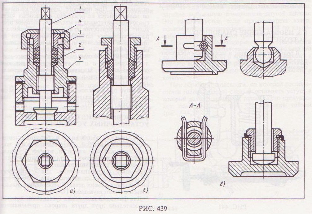 На чертеже сальникового уплотнения втулка выдвинута из гнезда вверх до соприкосновения с накидной гайкой, которую, в свою очередь, показывают навинченной только на 2–3 витка резьбы корпуса. Такое изображение наглядно показывает, что по мере утери упругих свойств шнуров уплотнение можно регулировать подтяжкой накидной гайки. Довольно часто для упрощения сальниковую набивку изображают на чертежах сплошной (рис. 439, б), не отражая форму сечения шнуров, используемых для набивки. На рис. 439, в показано шарнирное крепление клапана на шпинделе, обеспечивающее плотное прилегание клапана к седлу.