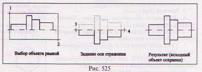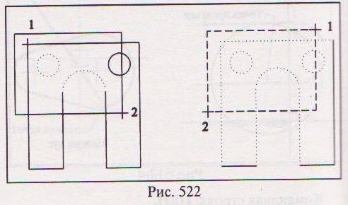 Рамка выбора - это прямоугольник, появляющийся в графической области окна Автокада и задаваемый вершинами двух противоположных углов. При этом если второй угол рамки находится правее первого (стороны прямоугольника - сплошные линии), то отмечаются объекты, полностью заключенные в рамку. Если второй указанный угол находится левее первого (стороны прямоугольника -штриховые линии), то отмечаются объекты, как полностью захваченные рамкой, так и частично (рис. 522).