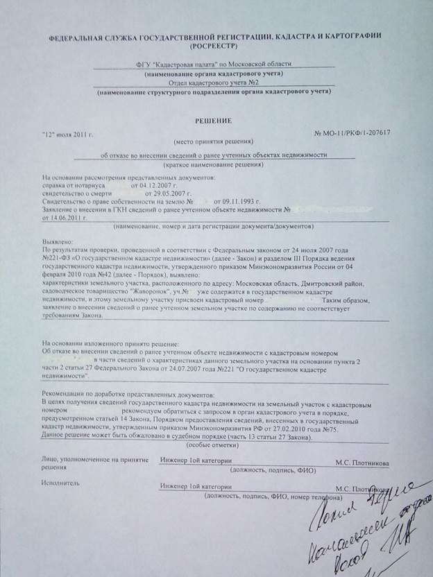 Очень часто при обращении гражданина в ФГУ " Кадастровая Палата" по Оренбургской области заявители получают разного рода отказы. Юридическая фирма «Fenix56» поможет разобраться в причинах этих отказов. Орган кадастрового учета принимает решение об отказе в осуществлении кадастрового учета в следующих случаях: 1. заявление о кадастровом учете или необходимые для кадастрового учета документы по форме либо по содержанию не соответствуют требованиям Закона о кадастре; 2. объект недвижимости, о кадастровом учете которого представлено заявление, образуется из объекта недвижимости или объектов недвижимости и раздел или выдел доли в натуре либо иное совершаемое при таком образовании действие с преобразуемым объектом недвижимости или преобразуемыми объектами недвижимости не допускается в соответствии с установленными федеральным законом требованиями; 3. объект недвижимости, о кадастровом учете которого представлено заявление, образован из объекта недвижимости, внесенные в государственный кадастр недвижимости сведения о котором носят временный характер; 4. с заявлением о кадастровом учете обратилось ненадлежащее лицо; 5. истек срок приостановления осуществления кадастрового учета и не устранены обстоятельства, послужившие основанием для принятия решения о приостановлении; 6. межевой план, технический план или акт обследования заверен подписью неуправомоченного лица. 7. размер образуемого земельного участка или земельного участка, который в результате преобразования сохраняется в измененных границах, не будет соответствовать установленным в соответствии с земельным законодательством требованиям к предельным (минимальным или максимальным) размерам земельных участков; 8. доступ (проход или проезд от земельных участков общего пользования) к образуемому или измененному земельному участку не будет обеспечен, в том числе путем установления сервитута; 9. одна из границ такого земельного участка пересекает границу муниципального образования и (или) границу населенного пункта; 10. такой земельный участок образован из земельных участков, относящихся к различным категориям земель. 11. в результате данного кадастрового учета площадь этого земельного участка, определенная с учетом установленных в соответствии с настоящим Федеральным законом требований, будет больше площади, сведения о которой относительно этого земельного участка содержатся в государственном кадастре недвижимости, на величину более чем предельный минимальный размер земельного участка, установленный в соответствии с земельным законодательством для земель соответствующего целевого назначения и разрешенного использования, или, если такой размер не установлен, на величину более чем десять процентов площади, сведения о которой относительно этого земельного участка содержатся в государственном кадастре недвижимости; 12. при уточнении указанных границ нарушен установленный Законом о кадастре порядок согласования местоположения границ земельных участков или местоположение указанных границ в соответствии с Законом о кадастре не считается согласованным, за исключением случаев признания указанных границ уточненными в порядке разрешения земельного спора.