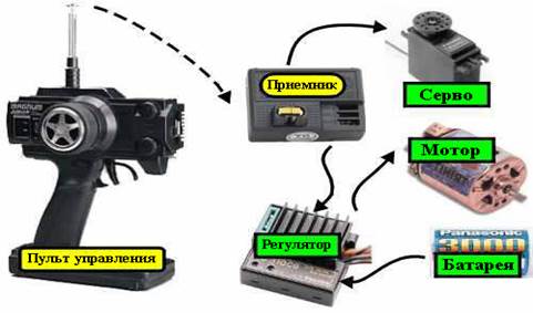 Не важно какой тип шасси и какой масштаб Вы выберете, Вам понадобится система радиоуправления моделью. Многие фирмы делают модели часть своих моделей в форме RTR (Ready To Run) – готовые к использованию прямо из коробки – они как правило уже собраны и включают все необходимое, в том числе и пульт управления. Впрочем, часть моделей все равно продается в виде комплекта для сборки и аппаратуру управления придется покупать дополнительно. Давайте рассмотрим принцип управления моделью. Система радиоуправления моделью автомобиля с электродвигателем: