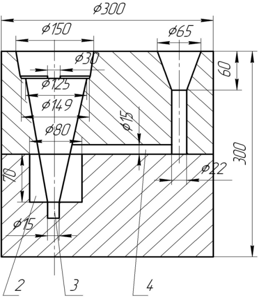 Измерение объема усадочных раковин и пор: Для определения склонности того или иного сплава к образованию усадочных раковин и пор применяют различные технологические пробы. Это технологическая проба американского бюро стандартов и проба Шварца, используемые за рубежом. В России чаще всего для этих целей используется конусная проба (см. рисунок). Эта проба имеет форму конуса 1, сужающегося книзу. За счет такой формы нижние части пробы затвердевают раньше, верхние – позже, то есть создаются условия для направленного затвердевания снизу вверх. Это способствует образованию концентрированной усадочной раковины в верхней части пробы. Для ускорения затвердевания нижней части пробы она может оформляться холодильником 2 из медного сплава. В нижней части пробы имеется цилиндрический прилив 3 диаметром 15 мм, служащий для определения нормальной плотности сплава. Верхняя часть пробы закрывается верхним кольцевым холодильником, представляющим собой круглую стальную пластинку толщиной 3 – 5 мм с отверстием d = 30 мм в центре. Металл в пробу заливается через литник 4. Склонность сплава к образованию усадочных раковин и пор оценивают сравнением плотности заведомо здорового участка пробы (прилив 3) с плотностью участка, в котором имеются усадочные дефекты (конусная часть 1). Для этого необходимо измерить плотность, объем и массу пробы плотного сплава. Плотность находят гидростатическим взвешиванием прилива. Объем усадочных пустот Vп находят по формуле