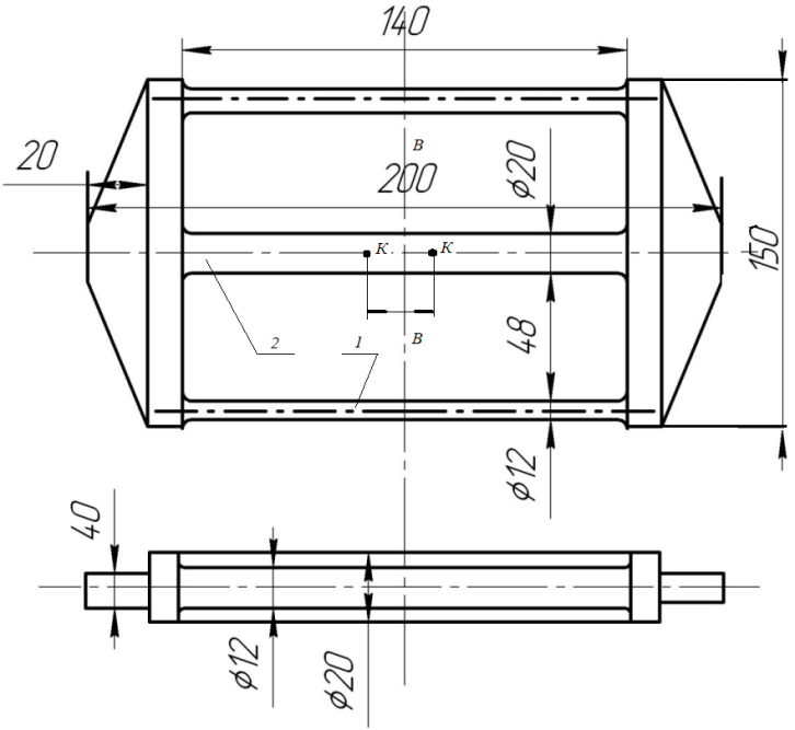 Рисунок 1 – Усадочная решетка для определения температурных напряжений: 1 – тонкие брусья; 2 – толстый брус; ВВ – место резки; К – места нанесения меток