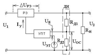 Силовая цепь стабилизатора представляет из себя регулирующий элемент (РЭ) и нагрузку (RН). За счет изменения падения напряжения на РЭ поддерживается постоянство напряжения на нагрузке U2. Цепь отрицательной обратной связи по напряжению (ООС) включает в себя: делитель напряжения (ДН), усилитель постоянного тока (УПТ), источник эталонного напряжения (UЭТ). Напряжение обратной связи (UОС) снимается с нижнего плеча ДН (RД2) и подается на вход УПТ, где происходит сравнение UОС и UЭТ. В УПТ усиливается разностное напряжение (сигнал ошибки Uε = UОС - UЭТ), что приводит к изменению тока управления (IУ) и изменению падения напряжения на РЭ (∆ UРЭ). Напряжение на выходе (U2) при этом восстанавливается до своего первоначального значения. Например, при возрастании напряжения на входе (U1) или уменьшении тока нагрузки происходит увеличение сигнала ошибки (Uε), уменьшение тока управления (IУ) и увеличение напряжения на РЭ и восстановление напряжения на нагрузке. Схема имеет более высокий КПД по сравнению со стабилизатором напряжения с параллельным РЭ. Недостатком схемы является невысокая надежность из- за возможных перегрузок РЭ по току.