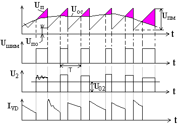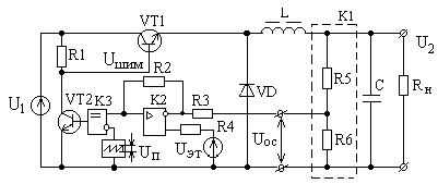 Силовой контур импульсного стабилизатора имеет три состояния. При подаче управляющего импульса (UШИМ) на силовой транзисторный ключ VT1 происходит передача напряжения источника питания U1 через открытый транзистор в нагрузку. Накапливается реактивная энергия в дросселе сглаживающего фильтра L. При размыкании ключа (на интервале паузы широтно- модулированного (ШИМ) сигнала) энергия дросселя передается через обратный диод VD в нагрузку. Если на интервале паузы ток дросселя спадает до нуля, то возникает режим прерывистого тока дросселя, при котором конденсатор разряжается в нагрузку. Схема управления включает в себя: делитель напряжения (R5, R6) с коэффициентом деления K1 = R6/(R5+R6); усилитель сигнала рассогласования с коэффициентом передачи K2 (Ue = UОС – UЭТ); компаратор напряжения K3, который формирует ШИМ - сигнал. Он равен “1”, если уровень пилообразного напряжения больше уровня напряженияUОС. При возрастании входного напряжения U1 уменьшается площадь между уровнем напряжения “пилы” и UОС, что приводит к уменьшению по длительности ШИМ- сигнала. Среднее значение напряжения на выходе при этом уменьшается, т.е. U2 восстанавливается.