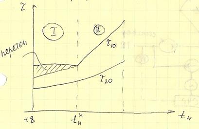 Из-за срезки температурного графика в зоне I, в систему отопления подается вода с завышенной температурой, что приводит к перетопу в помещении. Погодный регулятор уменьшает расход сетевой воды, контролируя его по τ 2о. . Контроллер сравнивает измеренное значение τ 2о с температурой по графику. При рассогласовании сигналов на привод клапана подается направляющий импульс: прикрыть или приоткрыть. Т.к. расход в системе отопления должен быть постоянным, а расход сети Gс уменьшается, то для обеспечения постоянства расхода Gсо на перемычке устанавливается корректирующий насос.