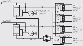 tвк =tвм +6 °С. (4) Заметим, что в примере на рис. 7.14 [3] приняты значения tвм = 19 °С и tw2 – tw1 = 4 °С. Но при таких исходных данных, вместо указанного в примере значения tвк = 23 °С, можно получить конечную температуру воздуха на выходе из воздухоохладителя не ниже 26–27 °С, что делает всю схему бессмысленной при tн = 28, 5 °С.