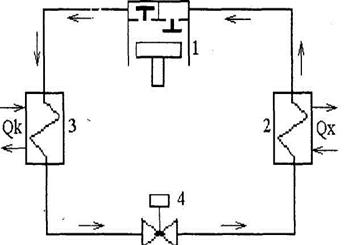 (2) водоаммиачный раствор кипит за счет подвода тепла от греющего источника в количестве Qr. В результате кипения давление паров аммиака в генераторе повышается до давления конденсации. Пары аммиака из генератора поступают в конденсатор(6), где охлаждаются и конденсируются, теплота конденсации Qk отводится в окружающую среду. В регулирующем вентиле (7) жидкий аммиак дросселируется, то есть понижается давление, и стекает в испаритель через сепаратор. В испарителе (9) жидкий аммиак кипит за счет тепла, отбираемого у охлаждаемой среды (Qo); образующиеся пары аммиака поступают в абсорбер (1) со слабым водоаммиачным раствором, поступающим из генератора через растворный теплообменник (4) и регулирующий вентиль (5). Слабый раствор аммиака в абсорбере поглощает пары аммиака, при этом образуется концентрированный водоаммиачный раствор, который насосом (3) подается в генератор (2). Далее холодильный цикл повторяется. 1)
