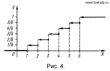 Итак для имеем F(x)=1/3. Аналогично вычисляются значения функции в промежудках , и . Наконец, если x> 6 то F(x)=1, так как в этом случае любое возможное значение (1, 2, 3, 4, 5, 6) меньше, чем x. График функции F(x) изображен на рис. 4.