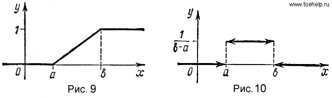 График функции F(x) представлен на рис. 9. Плотность распределения вероятностей найдем по формуле (25). Если x< a или x> b, то