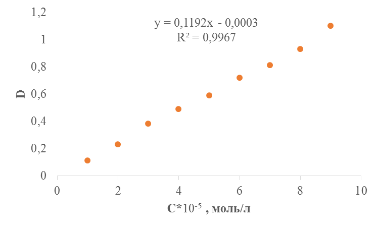 Для построения калибровочного графика необходимо измерили оптическую плотность приготовленных растворов при рабочей длине волны λ = 440 нм. В качестве раствора сравнения использовали 0, 1н раствор NaOH. Таблица 6. Зависимость оптической плотности от концентрации в щелочной среде