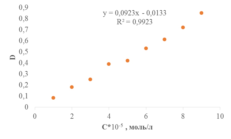 Рис 2. Калибровочный график определения концентрации красителя Кислотного желтого Светопрочного в 0, 1н растворе HCl. l = 1см, λ = 315 нм. По такому же методу готовили серии из 10 растворов красителя в растворе щелочи. Вычислили концентрации приготовленных растворов: