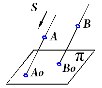 Названия и обозначения: • плоскость π - плоскость проекции • точка S - центр проецирования; • точка А0 – центральная проекция точки А на плоскость π; • прямая SА – проецирующая прямая. Характерной особенностью центрального проецирования является то, что размеры геометрических объектов будут искаженными