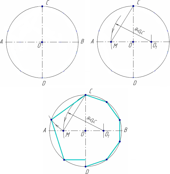 Чтобы разделить окружность на три, шесть или двенадцать равных частей: 1. В окружности заданного радиуса R проводят два взаимно перпендикулярных диаметра AB и CD; 2. Из любого конца диаметра (например из точки А) проводится дуга радиусом R до пересечения с окружностью в точках 1 и 2; 3. Отрезок 12 будет являться стороной правильного треугольника 1В2; 4. Отрезки А1 = А2 равны стороне правильного вписанного в окружность радиуса R шестиугольника; 5. Отрезки 1С = 2D равны стороне правильного вписанного в окружность радиуса R двенадцатиугольника; 6. Отложив величину, равную 1/3, 1/6 и 1/12 окружности, делят ее на три, шесть и двенадцать равных частей; 7. Соединив последовательно засечки (вершины n-угольника) отрезками прямых, получают правильные трех-, шести- и двенадцатиугольники.
