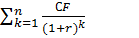 Рис.3. Схема приведенного потока постнумерандо Логика рассуждений в этом случае такова. Пусть имеем исходный денежный поток CF1, CF2..., CFn. Представим себе, что это совокупность регулярных доходов по ценной бумаге, которую инвестору предлагают купить. Инвестор хочет понять, сколько он готов заплатить за возможность обладания данным потоком. Речь идет о грамотном участнике рынка, который знаком с понятием временной ценности денег и, кроме того, хотел бы получить приемлемое вознаграждение за единовременное отвлечение своих собственных средств, неизбежное при покупке ценной бумаги. Очевидно, что напрашивающееся простое суммирование элементов потока CFn, невозможно, поскольку они находятся в разных временных интервалах, что обусловливает их несопоставимость (в частности, из-за временной ценности денег). Эта несопоставимость устраняется с помощью дисконтирования по схеме сложных процентов. Финансовая операция подразделяется на nбазисных периодов, к концу каждого из которых привязан очередной платеж CFk, {на рисунке это 6 периодов). Расчет дисконтированной стоимости данного потока сводится к приведению каждого его элемента к началу финансовой операции, т. е. в точку 0, т. е. к делению на множитель (1 + r ) в соответствующей степени. Элемент CF1 отдален от точки приведения на один интервал, потому он делится на (1 + r); элемент CF2 отдален двумя интервалами, а потому делится на (1 + r)2, и т. д. После приведения всех элементов потока в точку 0 их можно просуммировать. Приведенная стоимость потока постнумерандо рассчитывается по формуле: PVpst = Задача 3. Рассчитайте сегодняшнюю стоимость срочного аннуитета постнумерандо при условии, что величина равномерного поступления составляет 10 000 рублей в год, процентная ставка 10%, срок – 6 лет. PVpst = Оценка приведенного потока пренумерандо Для обратной задачисхема дисконтирования, т. е. приведения всех элементов исходного потока в точку 0, может быть представлена следующим образом.