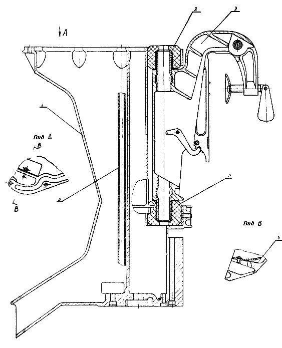 Дейдвудная труба (1) выполнена из алюминиевого сплава и является элементом, соединяющим двигатель, редуктор и подвеску. Двигатель с подмоторной плитой и коллектором крепятся к верхнему фланцу, редуктор - к нижнему. В дейдвудной трубе имеются специальные гнезда, в которые установлены амортизаторы (2) для соединения с вертлюгом (3) подвески. В верхней части дейдвудной трубы имеется карман, из которого вода через специальное отверстие поступает наружу, а через пластинчатый клапан (4) — во внутреннюю полость трубы. Внутренняя полость дейдвудной трубы разделена перегородкой надвое. В заднюю часть поступают выхлопные газы и отработанная охлаждающая вода, в этой же полости залита стальная трубка (5) для подвода охлаждающей воды от бесконтактного вихревого насоса. В передней части дейдвудной трубы проходит рессора привода гребного винта. Тяга реверсивной муфты редуктора проходит сквозь полую ось вертлюга. Подвеска (Рис. 5)