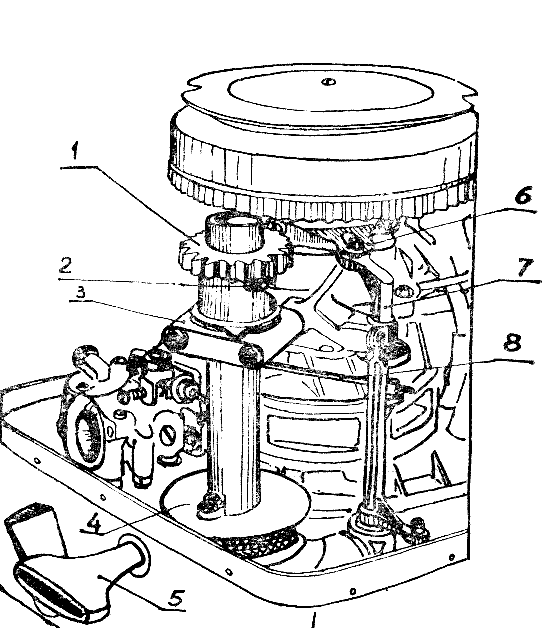 Лодочный мотор «Привет 22» состоит из следующих основных узлов: двигателя (1), коллектора (2), подмоторной плиты (3), редуктора (4), дейдвудной трубы (5), подвески (6), карбюратора (7), стартера (8), системы охлаждения, системы питания, системы зажигания. Картер двигателя (Рис. 3)