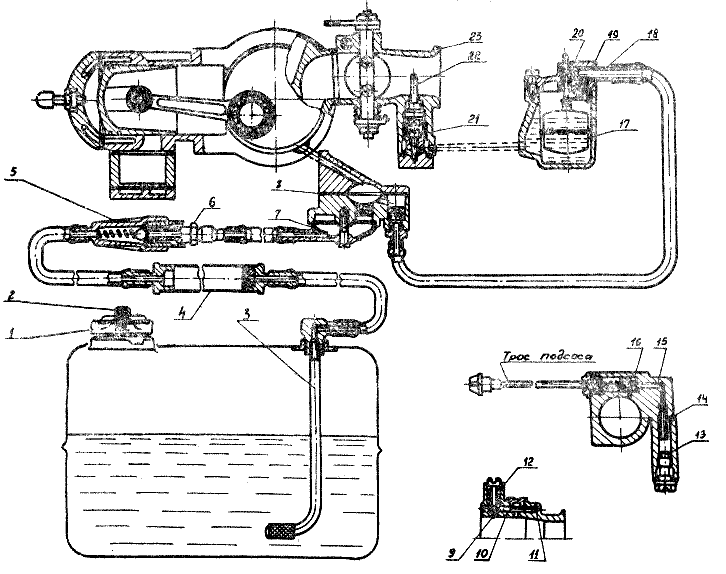 Система питания мотора состоит из топливного бака, соединительного шланга (с подкачивающей помпой), топливного насоса, карбюратора и топливных шлангов. Топливный бак емкостью 22 литра, переносный, имеет ручку для переноски, заливную горловину с крышкой и штуцер с заборником для подсоединения топливного шланга. Крышка бака (1) быстросъемного типа закрывается от руки путем поворота по часовой стрелке до упора. Уплотнение достигается при помощи кольцевой резиновой прокладки, которая поднимается за счет того, что концы распорной планки при повороте крышки скользят по винтовым скосам горловины. В крышке бака имеется винт (2), который при работе мотора должен быть немного вывернут для того, чтобы по мере выработки топлива в бак мог поступать воздух. Для предотвращения самопроизвольного поворота винта имеется пружина. При неработающем моторе винт нужно завернуть до упора во избежание утечки и испарения топлива. Топливо из бака в мотор поступает через заборник (3). Заборник представляет собой трубку с сетчатым фильтром на конце, другой конец трубки припаян к штуцеру, который соединяется с баком с помощью конической резьбы. Соединительный шланг из бензостойкой резины. Одним концом шланг надет на штуцер заборника топливного бака, на другом конце имеется муфта (5), которая надевается на штуцер (6) мотора. Внутри муфты находится шариковый клапан. Под действием пружины шарик закрывает выход из шланга, когда он отсоединен от мотора. При надевании муфты на штуцер конец штуцера отжимает шарик, давая проход топливу. Надевая муфту па штуцер, нужно повернуть ее так, чтобы выступы на штуцере вошли в пазы на муфте. Перед запуском мотора всю топливную систему нужно заполнить топливом. Для этого в средней части шланга имеется подкачивающая помпа-груша (4), вмонтированная в соединительный шланг. После подсоединения шланга к мотору нужно несколько раз нажать и отпустить грушу, пока вся система не заполнится топливом. Подкачивающее действие груши основано на совместной работе двух обратных клапанов, один из которых вмонтирован в самой груше, а другой находится в корпусе бензонасоса. Благодаря этим клапанам топливо при нажатии на грушу может выжиматься только к мотору. Топливный насос служит для подачи топлива из бака к карбюратору принудительно. Насос диафрагменного типа приводится в действие от изменения давления в полости картера верхнего цилиндра в зависимости от положения поршня двигателя. Корпус насоса состоит из двух частей, стянутых винтами, между которыми зажата диафрагма (8) из бензомаслостойкой прорезиненной ткани. Верхняя часть корпуса с диафрагмой соединена отверстием с кривошипной камерой верхнего цилиндра. Нижняя часть полости является частью топливной магистрали и имеет на входе и выходе обратные пластинчатые клапаны, пропускающие топливо только в направлении от бака к мотору. При изменении давления в кривошипной камере диафрагма колеблется вверх и вниз, засасывая топливо из бака и выталкивая его в карбюратор. Перед входом в насос топливо проходит отстойник (7) и сетчатый фильтр. Между отстойником и корпусом насоса ставится уплотнительная резиновая прокладка. Карбюратор (23) поплавкового типа с горизонтальным расположением смесительной камеры. Подача топлива в поплавковую камеру производится через штуцер (18) в крышке попла