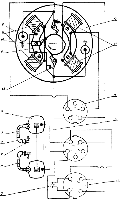 Электросистема мотора состоит из магдино (магнето-динамо) с двумя выносными трансформаторами (5), двух искровых свечей зажигания (3), кнопки останова мотора (7), соединительных низковольтных (6) и высоковольтных (1 и 4) проводов, штепсельных разъемов (15 и 16). Магдино МН-1 (двухискровое, маховичного типа) выполняет роль магнитного генератора тока. Основание магдино (12) - статор - представляет собой литой алюминиевый диск, на котором смонтированы: две первичные катушки зажигания (11), две катушки освещения (14), два искрогасительных конденсатора (9) типа КМ-4 (0, 17—0, 25 мкф), два прерывателя (13) с эксцентриками для регулировки в них зазора, смазочное устройство (войлочный фильц) (10) для смазки кулачка ротора и соединительные низковольтные провода типа БПВЛ, сечение 0, 75 мм (6). За пределы основания вынесены два высоковольтных трансформатора, выполняющие функцию вторичной цепи зажигания магдино. Расположенный над основанием магдино маховик-ротор представляет собой отлитый из алюминиевого сплава чашеобразный корпус, по внутреннему ободу которого расположены четыре постоянных магнита. Одноименные полюсы магнитов соединены посредством четырех полюсных башмаков, собранных из листовой трансформаторной стали. На ступице маховика выполнен эксцентрик, который при вращении маховика воздействует на подвижные контакты прерывателей. Сверху, на маховике имеются два дугообразных окна. Одно, помеченное точкой, служит для проверки и регулировки зазора между контактами прерывателей. Второе — для уравновешивания маховика. Маховик насажен на конусный хвостовик коленвала и зафиксирован на нем с помощью сегментной шпонки, шайбы и гайки с контровкой. Вращение маховика — по часовой стрелке (если смотреть сверху). Основание магднно центрируется на цилиндрическом выступе стакана в фиксируется на нем посредством пружинящей шайбы и стопорного кольца. Стакан крепится четырьмя винтами к верхней части картера. Благодаря скользящей посадке на фланце основание магдино имеет возможность поворачиваться относительно корпуса двигателя. Это позволяет менять угол опережения зажигания в зависимости от режимов работы двигателя, т. е. осуществлять блокировку магдино и карбюратора. Поворот основания магдино осуществляется при помощи водила (6) (Рис. 7), закрепленного двумя винтами на основании. В прорезь водила входит штырь поводка (7). Поводок связан тягой (8) с дроссельной заслонкой карбюратора. При вращении ручки румпеля поводок поворачивается, воздействуя одновременно на основание магдино и на дроссель карбюратора. От основания магдино отходят четыре низковольтных провода: два от катушек освещения (с изоляцией желтого, оранжевого или коричневого цвета) и два от прерывателей (черный или фиолетовый — от прерывателя нижнего цилиндра, натуральный или белый — от прерывателя верхнего цилиндра). Эти провода, объединенные попарно в полихлорвиниловые трубки, подводятся к штепсельному разъему (15). К контактам 1 и 2 розетки штепсельного разъема РВН1-5-2Г1 подведены провода от катушек освещения, а к контактам 4 и 5 — провода от прерывателей (натуральный или белый — от прерывателя верхнего цилиндра к контакту 4, и черный или фиолетовый — от прерывателя нижнего цилиндра к контакту 5). К контактам 4 и 5 вилки РВН1-5-1Ш1 подсоединены провода с изоляцией соответствующего цвета, соединяющи