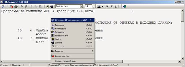 При наличии “фатальных” ошибок в исходных данных АВС в поле редактора выделяется строка данных, которая вызывает текущую ошибку (первую ошибку в списке ошибок, если их несколько).