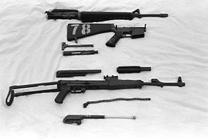 Разобранные автоматы: Автомат состоит из следующих основных частей и механизмов: § ствол со ствольной коробкой, прицельными приспособлениями и прикладом; § отъёмная крышка ствольной коробки; § затворная рама с газовым поршнем; § затвор; § возвратный механизм; § газовая трубка со ствольной накладкой; § ударно-спусковой механизм; § цевьё; § магазин; § штык.