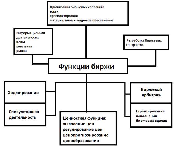 Рисунок 2. Функции бирж (1) На рисунке 2. Функции бирж, мы рассмотрели, сколько функций имеют биржи, далее мы более детально, рассмотрим, за что они отвечают: Организация биржевых собраний, для проведения публичных торгов, сюда входит: (8) · Организация торгов – биржа должна обладать хорошо оборудованным «рыночным местом», для большего количества покупателей и продавцов, если же торг ведется через электронные компьютерные терминалы, то биржа должна обеспечить высокоэффективную систему электронной торговли. · Материально-техническое обеспечение – включает в себя рабочие места, оборудование зала, компьютерное обеспечение. · Обучение персонала биржи – для того, что бы вести торги, биржа должна обладать профессиональным штатом сотрудников. · Разработка требований для участников торгов – лица, принимающие участие в торгах, должны знать правила работы на бирже, иметь навыки и знания в сфере биржевой торговли. Разработка контрактов: · Стандартизация размеров партий · Стандартизация к качественным характеристикам биржевых товаров · Выработка единых требований к расчетам по биржевым сделкам Биржевой арбитраж: · Данная функция биржи имеет большое значение, так как с помощью её выявляют торговцев, которые пытаются действовать с помощью мошенничества, а с другой стороны, оно помогает улаживать ошибки из-за неточности в договорах, компьютерных сбоях и др. Ценностная функция: · Выявление реально рыночных цен, а также их регулирования, для того, чтобы не допустить незаконных манипуляций цен. · Ценопрогнозирующая функция: «а) выявление и регулирование биржевых цен. Биржа участвует в формировании и регулировании цен на все виды биржевых товаров. Концентрация спроса и предложения на бирже, заключение большого количества сделок исключают влияние нерыночных факторов на цену, делают ее максимально приближенной к реальному спросу и предложению. Биржевая цена устанавливается в процессе ее котировки, которая рассматривается как наиболее важная функция биржи. б) ценообразующая и ценопрогнозирующая функция. Сосредоточение на бирже продавцов и покупателей товаров, массовый характер биржевых сделок и их огромные масштабы в силу того, что торговля ведется обычно крупными партиями товаров, превращает биржевые цены в представительные рыночные цены на биржевые товары, которые обычно лежат в основе образования цен на многие другие товары. В результате биржевые цены выполняют функцию ценообразования, становятся его базисом наряду со ставками заработной платы, нормами амортизационных отчислений и т.п. На бирже торгуют товарами с поставкой через несколько месяцев после даты заключения сделки, тем самым происходит процесс ежедневного прогнозирования цен на будущие даты поставки товара, т.е. имеет место реальное ценопрогнозирование и не только цен на биржевые товары, но и на все те активы, которые основаны на этих биржевых товарах» (10) Функция хеджирования: (14) · Биржевое страхование участников от неблагоприятных колебаний цен. · Эта функция основывается на фьючерские контракты, суть этого в том, что торговец - хеджер, должен стать одновременно и продавцом и покупателем товара, и в этом случае любое изменение цены нейтрализуется. Спекулятивная функция: · Она взаимосвязана с функцией хеджирования · Форма коммерческой деятельности, с целью по