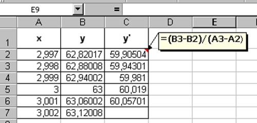 § в ячейку С2 введите формулу вычисления производной. Здесь ячейка В2 содержит значение хк+1, ячейка А2 - хк. § буксировкой скопируйте формулу до строки 7, получим значения производных в точках табуляции аргумента. Для значения х =3 производная функции равна значению 60, 019, что близко к значению, вычисленному аналитически.