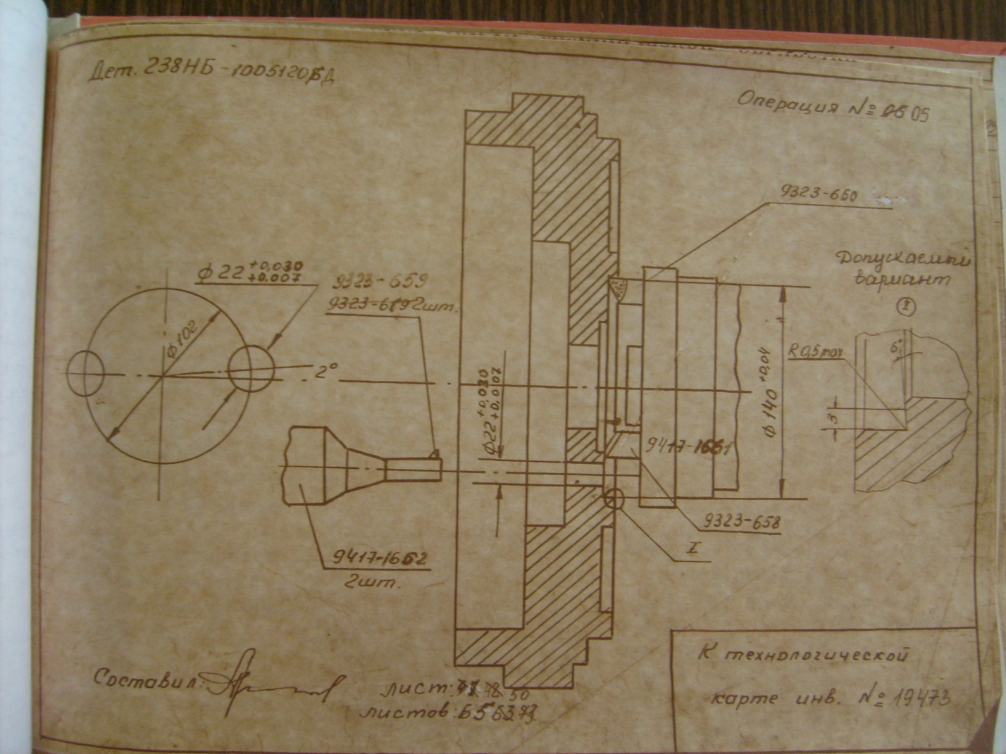 Установить на выточку Ø 140+0.4 под коленчатый вал, расточить окончательно Ø 415+0.12 на глубину 12 мм. Установить деталь в приспособлении и закрепить, снять деталь после обработки. Сверлить 8 отв. Ø 17.5+0.27 мм на проход. Точность расположения отв. В пределах 0.2 мм от номинал. положения. Ступенчатым сверлом сверлить 12 отв. Ø 8.43+0.22 х 12 на глубину 30 мм под резьбу М106Н и снять фаску в 12 отв. 1х90º. Нарезать резьбу М106Н и снять фаску в 12 отв. 1х90. Нарезать резьбу М106Н в 12 отв. на глубину 21 мм. Снять фаски 1±0.4х45 в 8 отверстиях Ø 17.7мм.