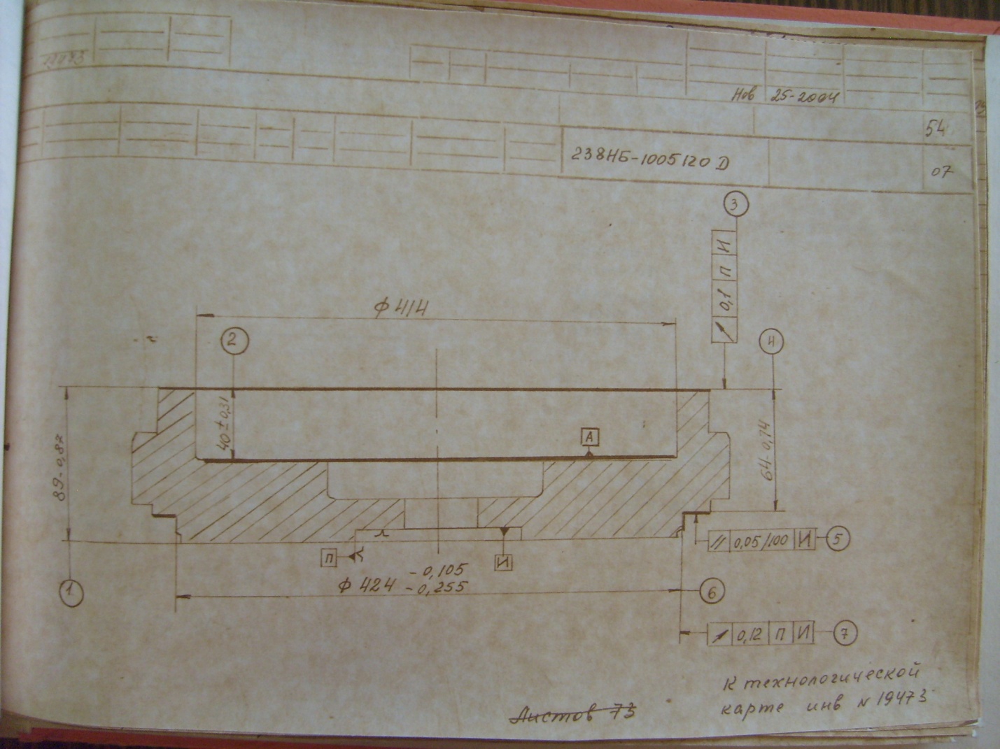 Установить деталь в приспособлении и закрепить, снять после обработки. Сверлить 12 отв. Ø 12.5+0.43 равнорасположенных по окружности на глубину 37 мм, не более. Проточить окончательно верхний торец и плоскость А до Ø 414, выдерживая размеры 1, 2, 3. Обточить окончательно диаметр под обод, проточить торец под обод, выдерживая 4, 5, 6,