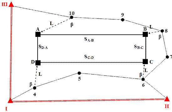 Вынесение в натуру проекта межевания с использованием теодолитного хода – наиболее трудоемкий способ построения фигур разбивки. Этот способ целесообразно использовать в том случае, когда недостаточно пунктов исходного геодезического обоснования, или они расположены на значительном удалении от выносимого в натуру проекта межевания земельного участка, при этом имеют расположение, при котором использовать обратную угловую засечку не представляется возможным. Возможная схема проектирования данного способа разбивки приведена на рис. 4.63. Следует отметить, что точки теодолитного хода желательно располагать в непосредственной близости от выносимого в натуру проекта межевания земельного участка или объекта землеустройства. В результате выполнения измерений и их математической обработки получают уравненные координаты всех точек теодолитного хода (X4, Y4,...). Используя эти значения и аналитические координаты межевых знаков (XA, YA, …), вычисляют элементы (β, L) для редуцирования (переноса) точек теодолитного хода в проектное положение межевых знаков по формулам (4.71) и (4.76). Для контроля качества выполненной разбивки выполняют контрольные измерения по границам территориальной зоны или земельного участка (SA-B). На основании сравнения измеренных длин линий и их проектных значений делают заключение о качестве выполненных работ на основании следующего статистического критерия: