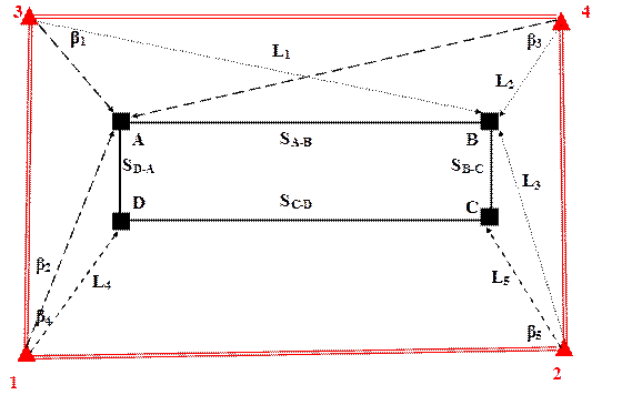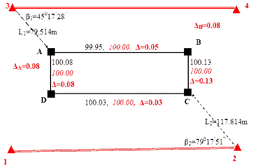Рис. 4.66. Исполнительный чертеж вынесенного в натуру проекта 100, 08 – измеренное значение контролируемого элемента; 100, 00 – эталонное значение контролируемого элемента; Δ = 0, 08 – расхождение между измеренным и эталонным значением контролируемого элемента; β 2 = 79о17'51''; L2 = 117, 814 м – измеренные значения для контроля качества положения межевого знака в методе полярных координат; Δ А = 0, 08 – наибольшая сторона треугольника ошибок для прямой угловой или линейной засечки
